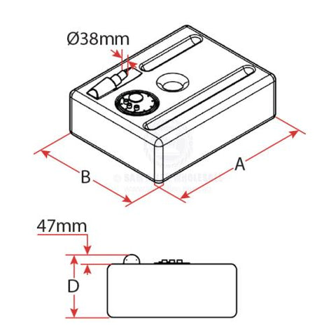 Features include a removable inspection port, vented cap, 38mm filler port suits standard refuelling hose, stepped Dia. 16mm (5/8 inch) / Dia. 19mm (3/45 inch) tail for external breather, 10mm tail for fuel hose, blanked 1/4 inch BSP port for a second fuel pickup or diesel return and provision for a standard 5 hole fuel sender or gauge.