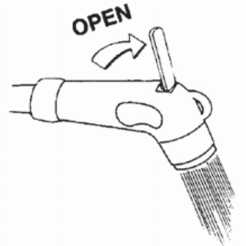 The moulded plastic shower head has a lever action on / off switch and a moulded eye to hang it up.